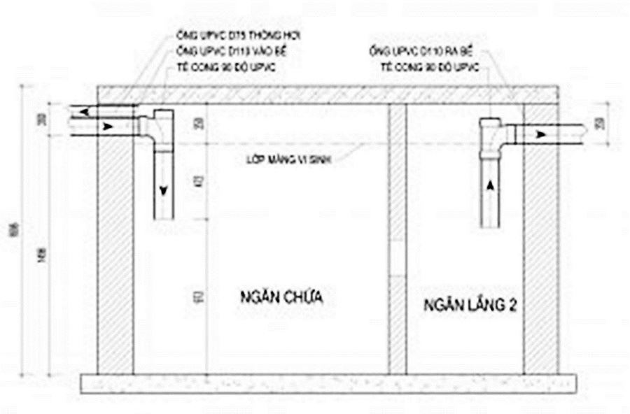 Hình trên là sơ đồ lắp đặt chuẩn của 1 bể phốt đúng kỹ thuật.